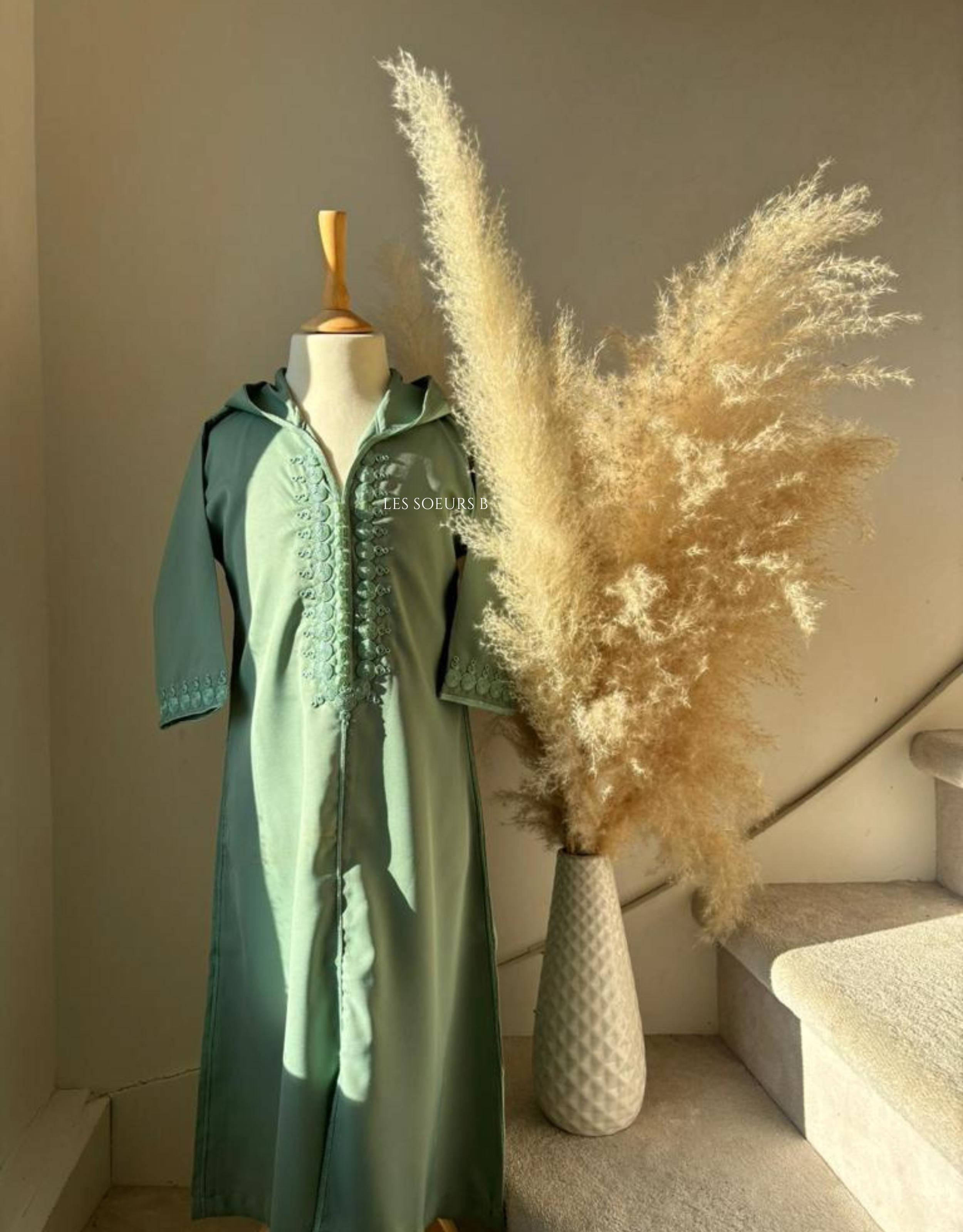 Jellaba verte pâle, manche longue avec capuche.