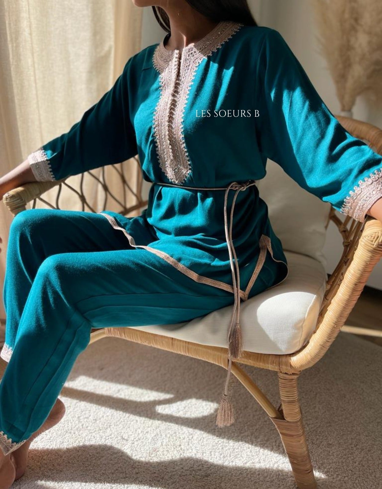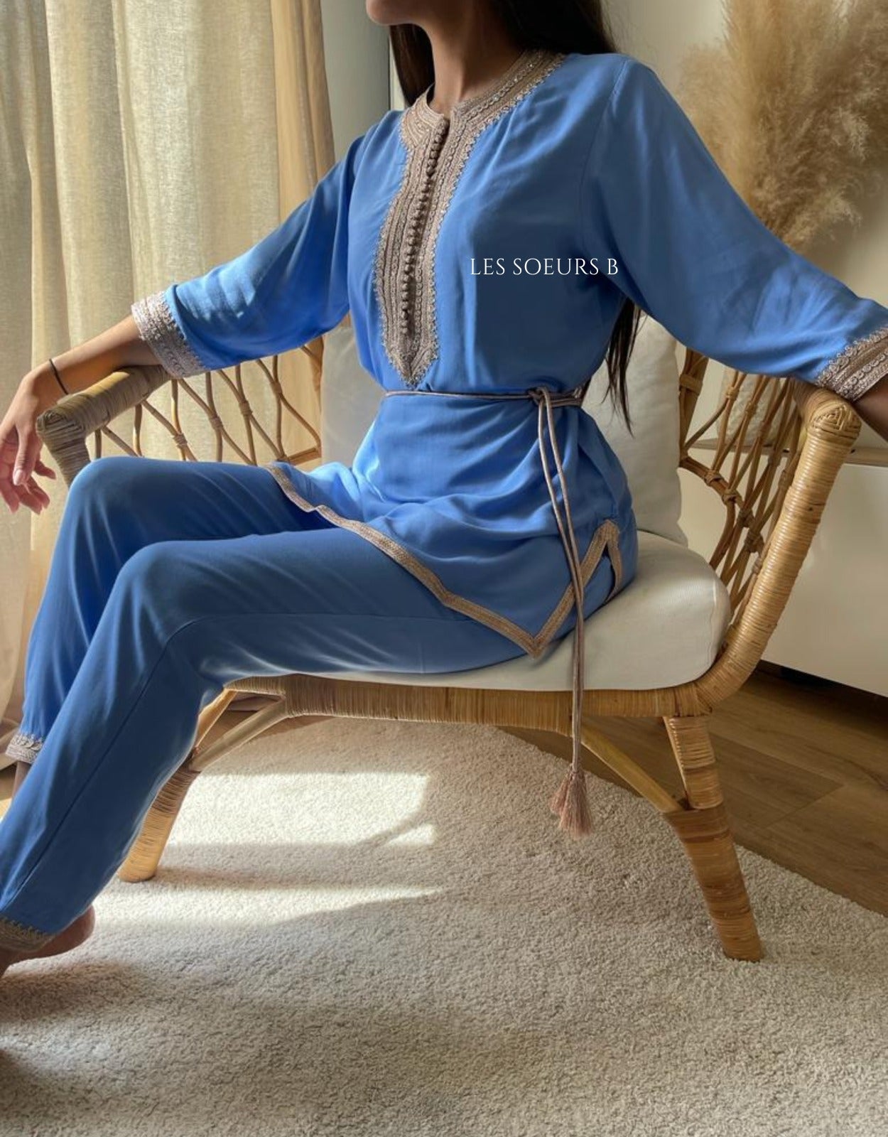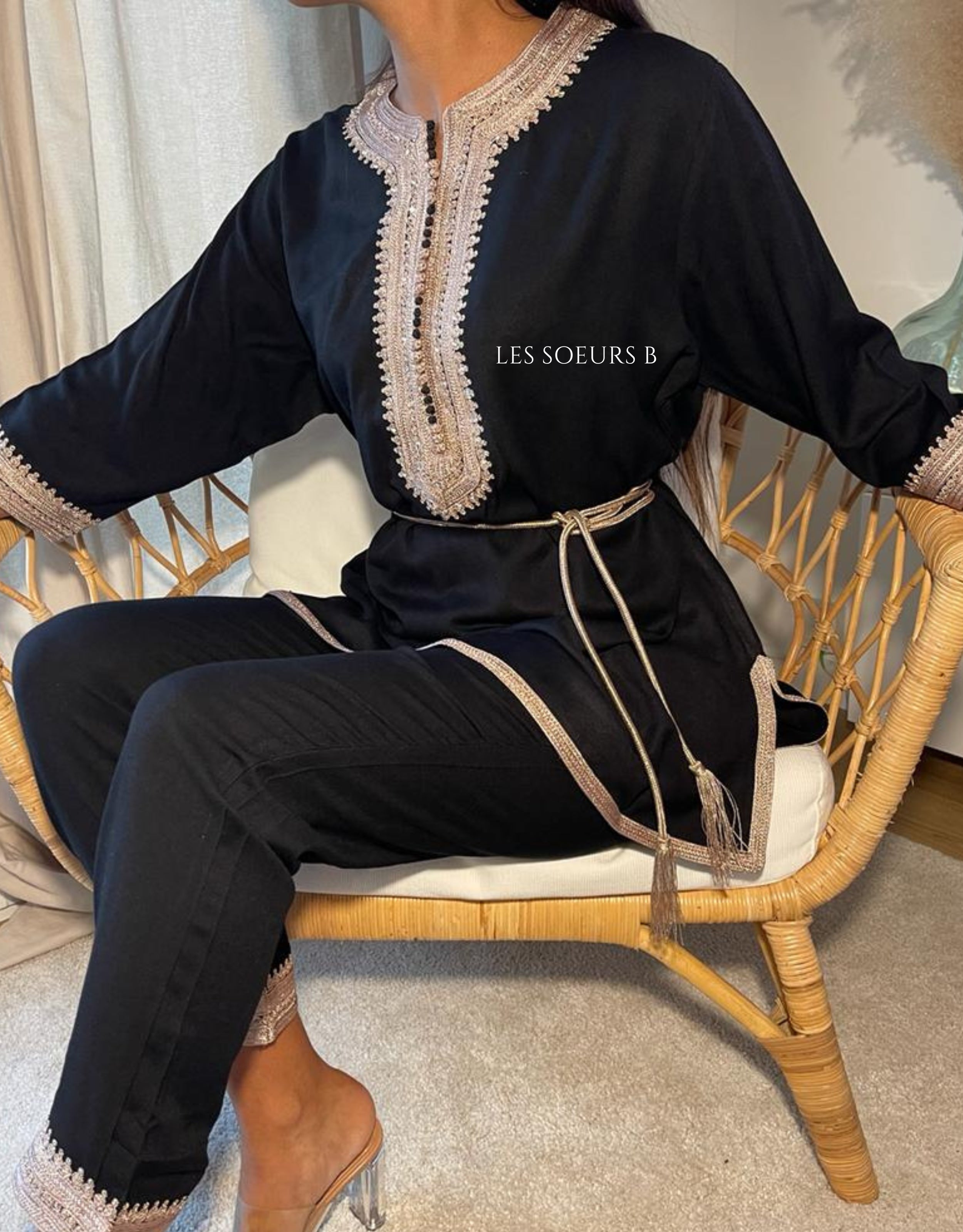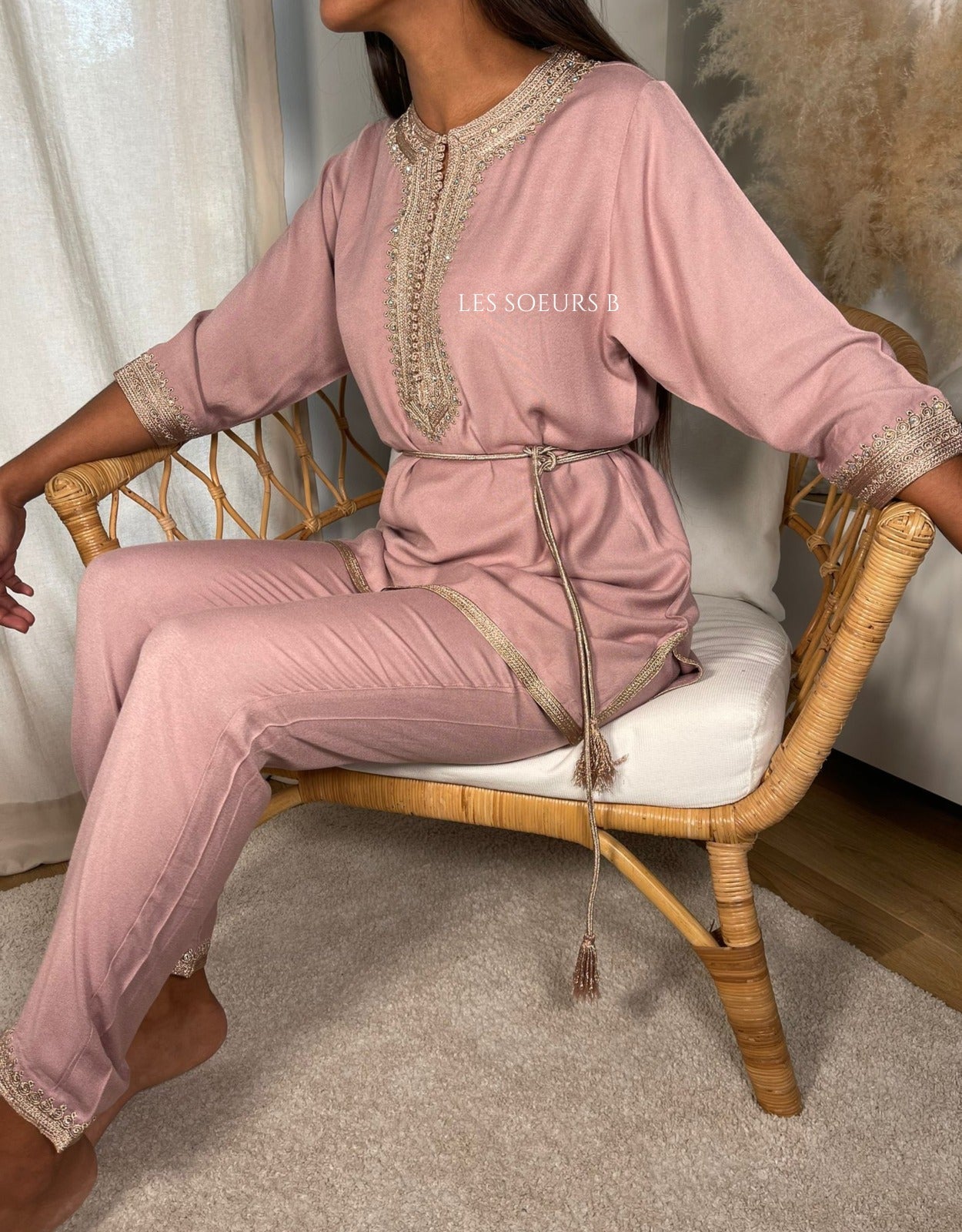 Jabador avec la broderie rose gold, deux pièces. Manche 3/4. Les perles sont collées sur la tenue. La ceinture n'est pas fournie avec le jabador.