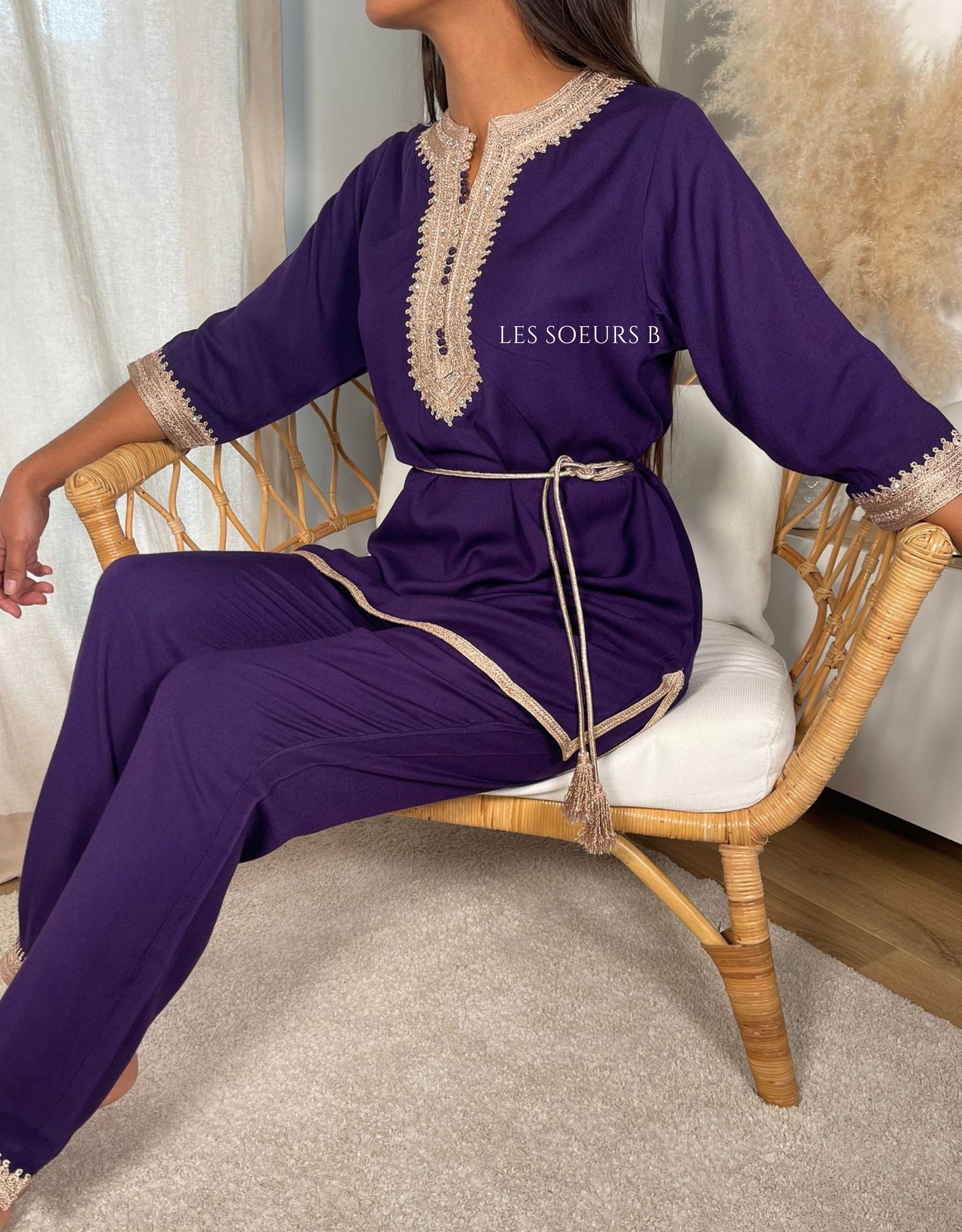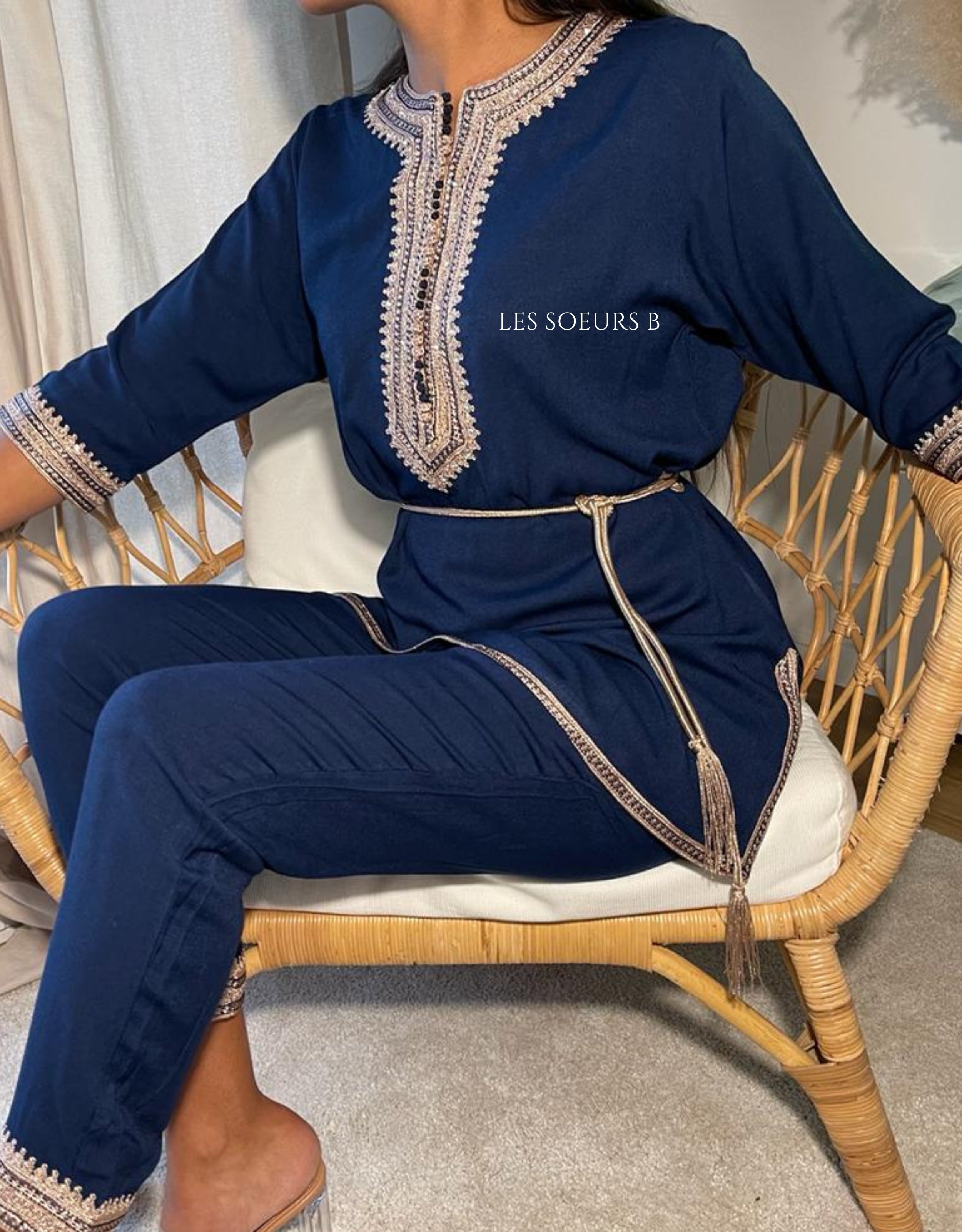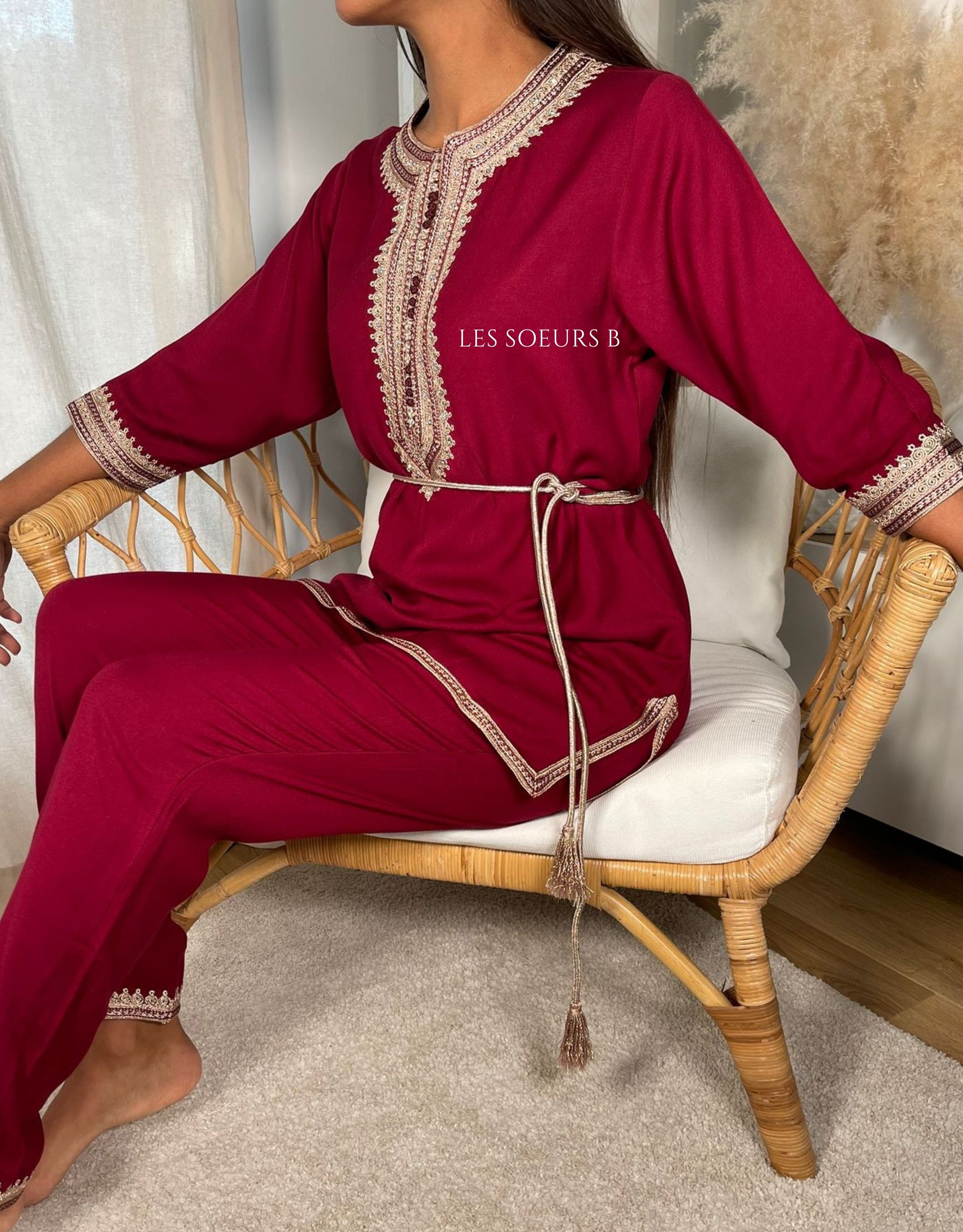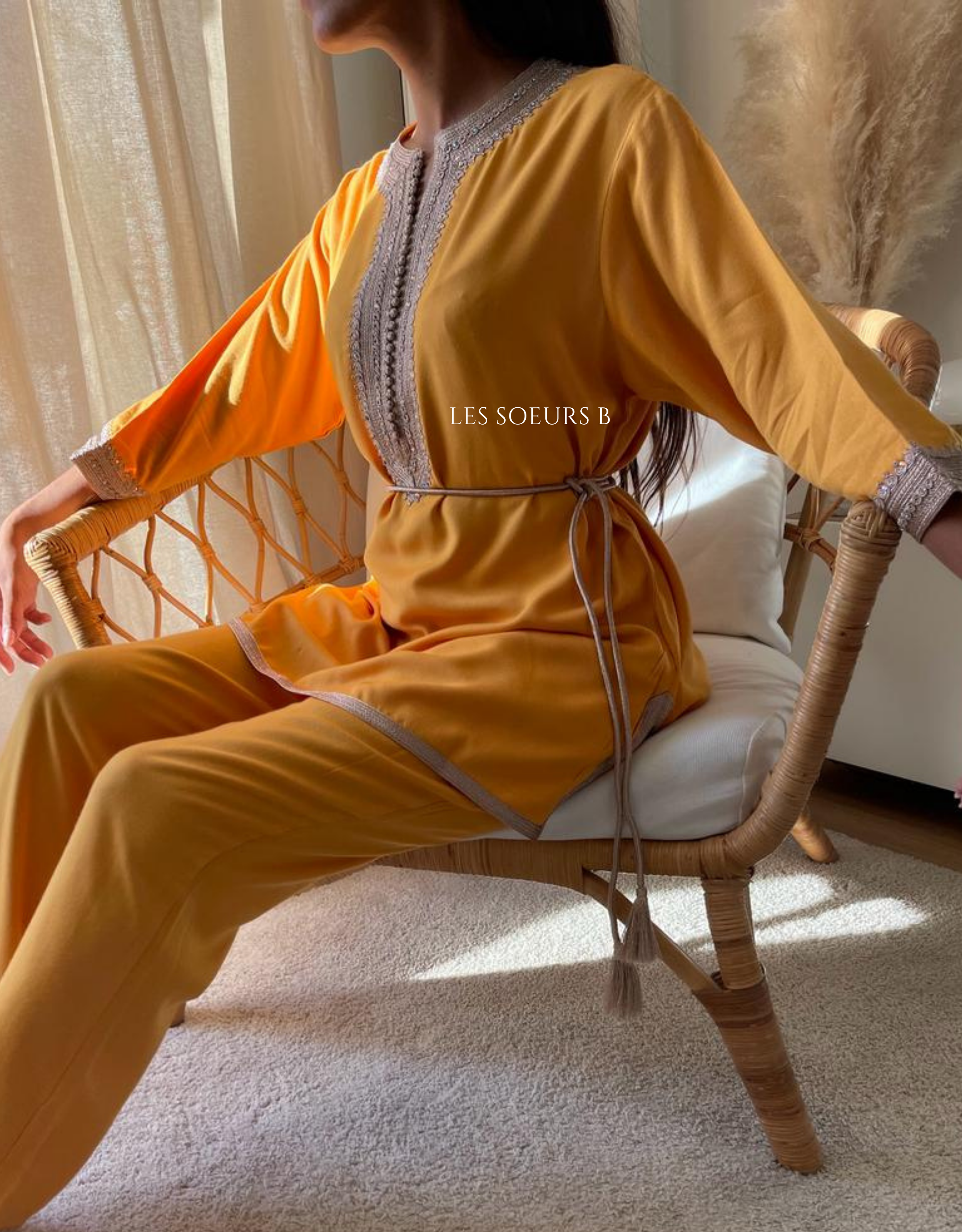 Jabador avec la broderie rose gold, deux pièces. Manche 3/4. Les perles sont collées sur la tenue. La ceinture n'est pas fournie avec le jabador.